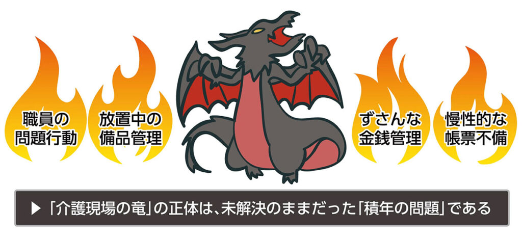 介護事業所に「竜」は数多く存在する。黙ってサービス残業を繰り返す職員、職場のルールを守らない職員、業務上の命令違反を繰り返す職員、協調性がなさすぎる職員、感情的になることが多い職員、実質的な支配力を持ちながら公には何ら責任をとらない裏ボスの存在などがそれにあたる。故障したまま放置された機器類、現場が必要と考えている備品購入の棚上げ、ずさんな金銭管理・在庫管理、慢性的な介護保険関連帳票の不備なども竜の仲間だ。