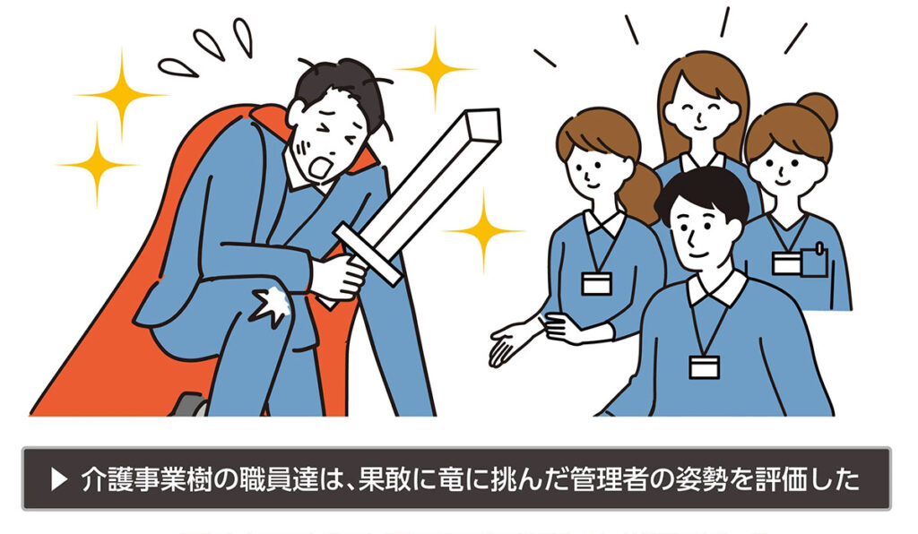 村の住人たちは竜退治の結果がすべてだが、介護事業樹の住人たちはそのプロセスも見た上で、竜退治から帰還した管理者を受け入れてくれる度量がある。チャレンジしないのはもったいない。まず大事なのは、問題解決の能力よりも、問題解決への尽力なのである。