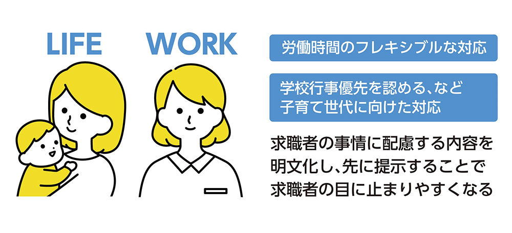 「応相談」の一言で終わらせるのではなく、求人票等にはじめから、相談に応じることができる範囲を記載しておくのも一案だ。労働時間のフレキシブルな対応や、子育て世代には学校行事優先を認めるなど、事情に配慮するその内容を明文化し、先に提示しておく。そうすることで、そのような働き方を求めている求職者の目にとまる確率は高くなる。
