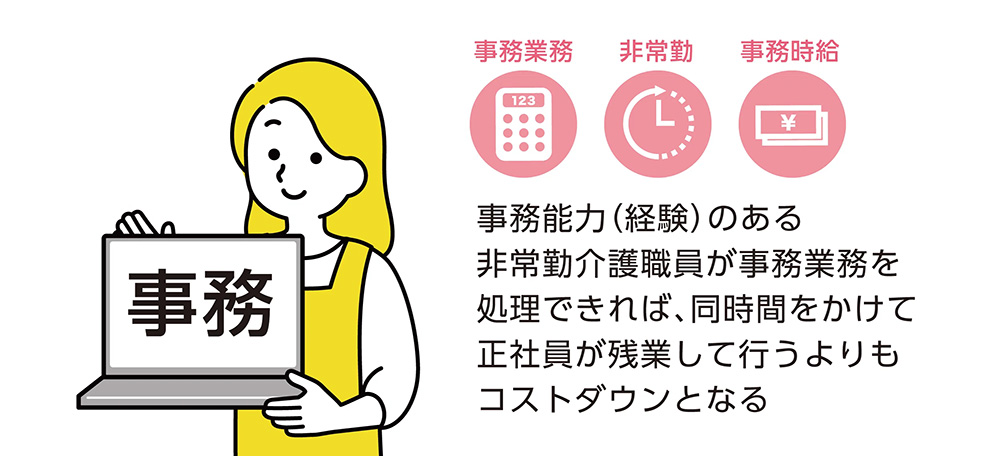介護現場の人材というのは本当に多様である。非常勤介護職の中には、事務職経験者もいる。身も蓋もない話になってしまうが、仮に正社員と同じ時間をかけて非常勤がその事務を処理できるのなら、残業代と事務時給の差額はコストダウンになる。