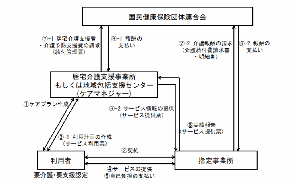 そして、それらをもとに、介護報酬が居宅介護支援事業所、指定事業者へ支払われます(⑧-1、⑧-2)。