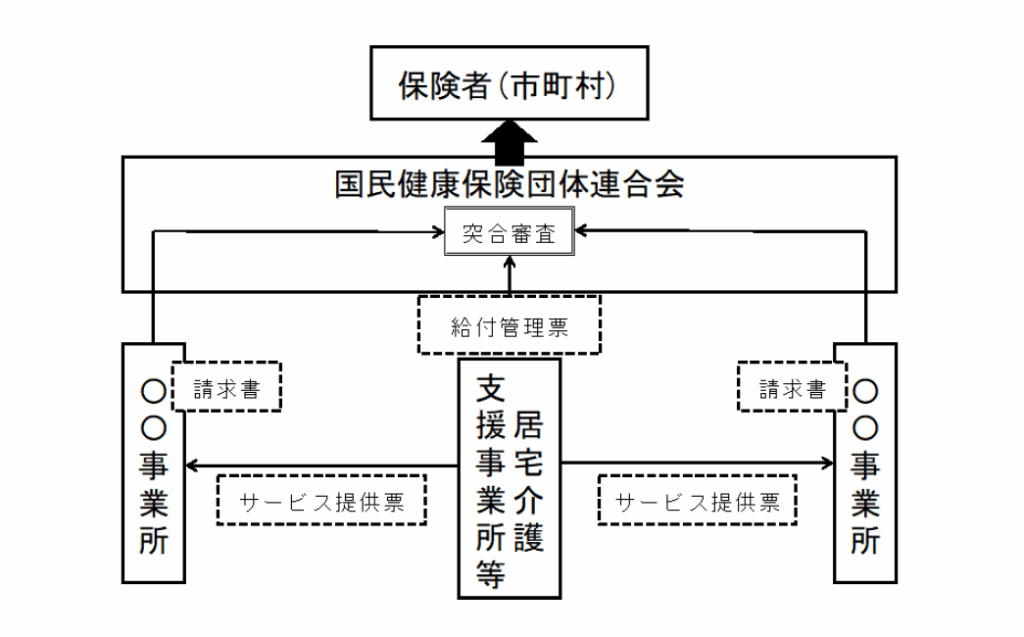 同時に、指定事業者は先述の「サービス提供票」(実績の記載済み)をもとに「介護給付費請求書・明細書」を作成し国民健康保険団体連合会へ利用者に提供されたサービスの費用(自己負担分を除く保険請求額)を請求します(⑦-2)。