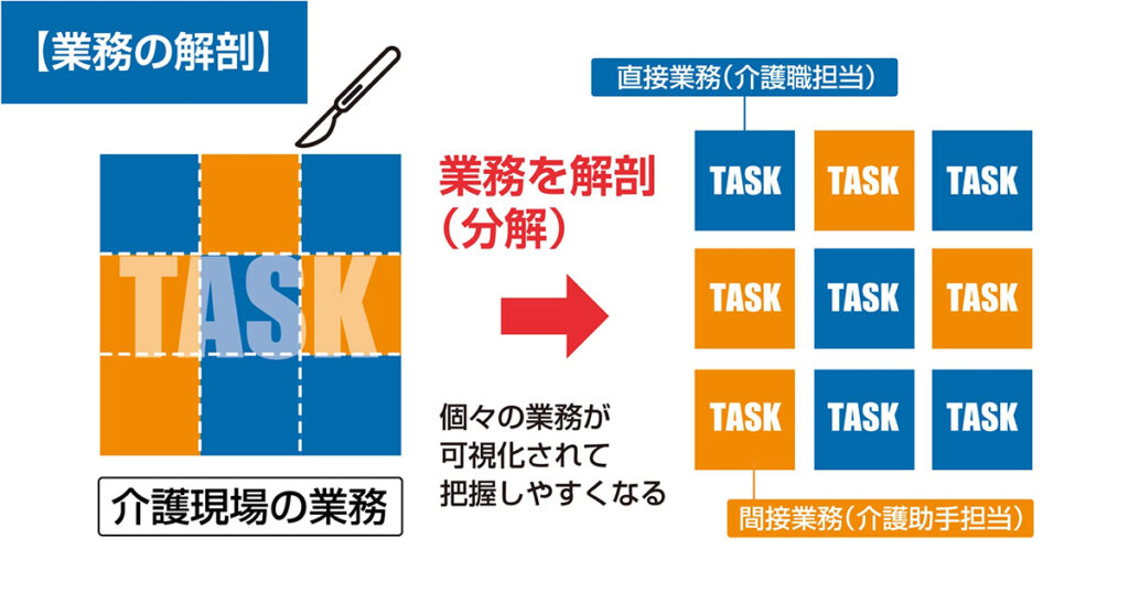 業務の細分化という体験でも同じようなことが起こる。日々の仕事を細かく切り分けてみることで業務アセスメントの精度が上がり、隠れていた仕事が見つかる。細分化によって具体化された仕事は、中身が明確でとっつきやすく、それが新たな働き手の開拓につながる。また、細分化されて範囲が狭くなった仕事は職員にすれば教えやすく、介護助手にとっては覚えやすい。