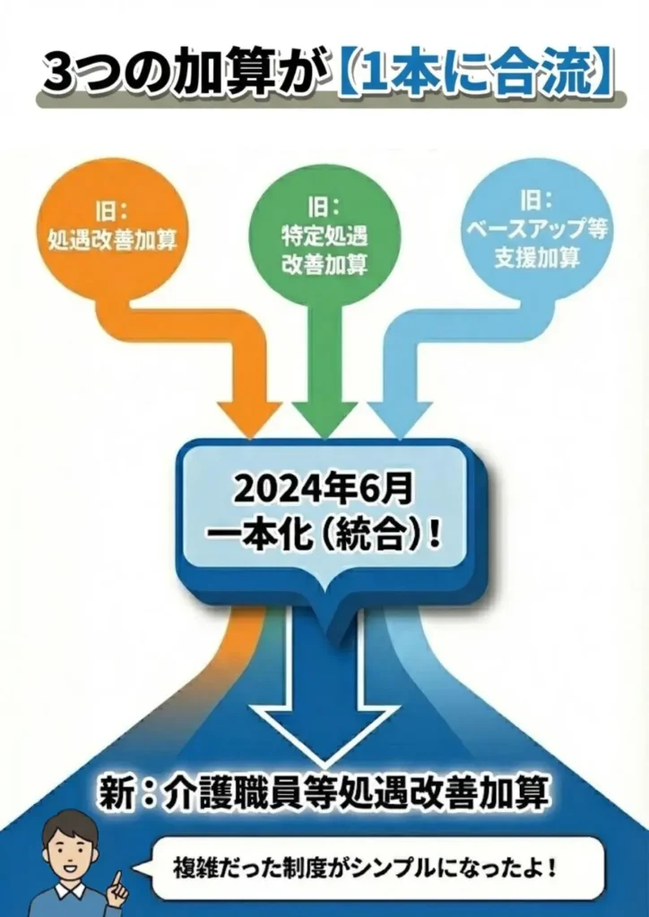 2024年6月から旧3加算(処遇改善・特定・ベア支援)が「介護職員等処遇改善加算」へ統合される