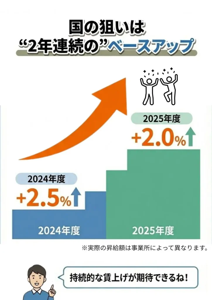 2024年度の介護報酬改定では、従来の3つの処遇改善関連加算をまとめた介護職員等処遇改善加算が始まり、令和6年度に2.5%、令和7年度に2.0%の賃金引き上げを目指す方向です。