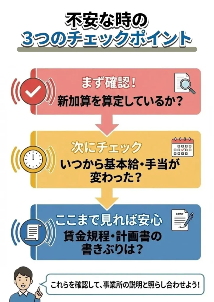 ①新加算を算定しているか、②いつから基本給や手当の金額が変わったか、③処遇改善計画書・賃金規程にどう書かれているか、の3点を確認しましょう