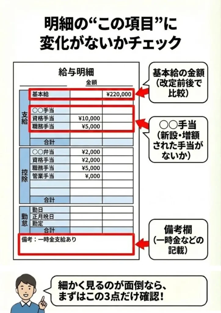 ①前年同月の給与明細と比べて、総支給額と手取り額、②住民税・社会保険料の金額、③処遇改善やその他手当の欄を一覧にして比べてみましょう。そのうえで、「どの項目が何円変わったのか」を整理すると、原因が処遇改善なのか、それ以外の要因なのかを切り分けやすくなります。