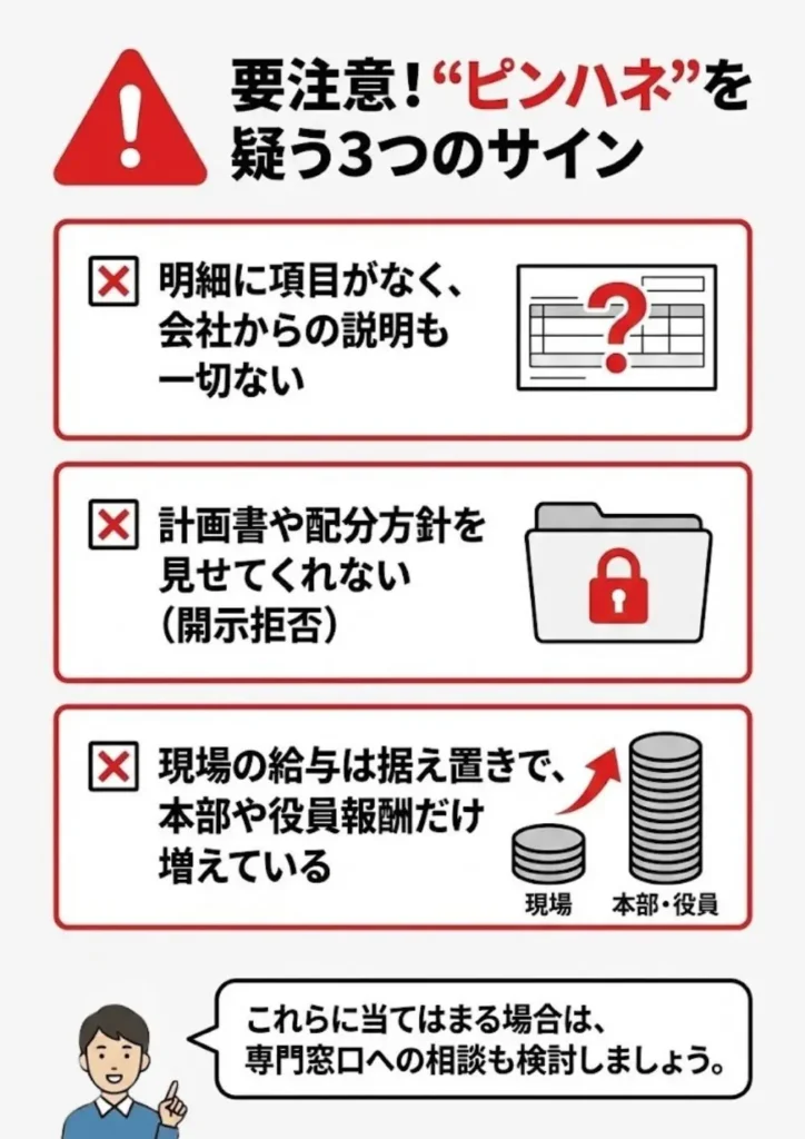 たとえば、①処遇改善加算を取っているのに給与明細にそれらしい項目がなく説明もない、②処遇改善計画書や配分の考え方を見せてくれない、③現場職員より本部や管理部門に多く配分している、④同時期に基本給を下げて合計額がほとんど増えていない、といった点が重なっている場合は注意が必要です。