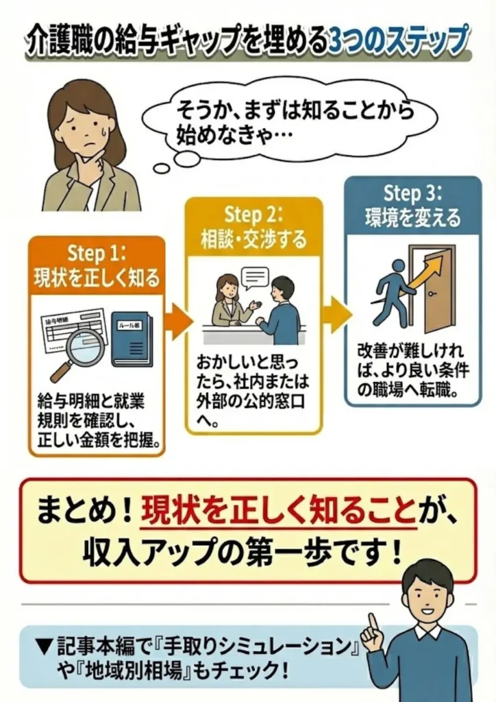 ①処遇改善計画書・実績報告書の内容を見せてもらう、②介護サービス情報公表システムで取得している加算を確認する、③給与明細と就業規則を照らし合わせ、「どの名目でいくら支給されているか」を一覧表にしてみる、という3つのステップが有効です。それでも不自然さが残る場合は、外部の相談窓口に相談することも検討しましょう。