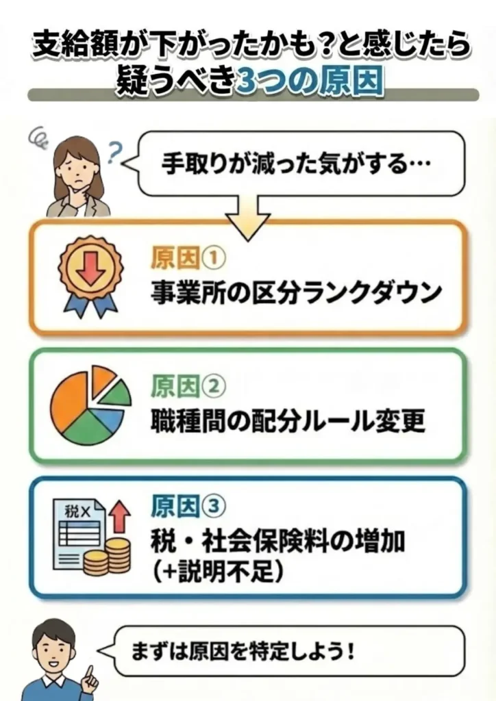 大きく分けて3つ考えられます。①事業所が新加算の上位区分を取れず、加算率が下がった(ランクダウン)、②一本化に伴って事業所内の配分ルールが変わり、介護職の取り分が薄くなった、③説明不足のまま基本給への振り替えや税・社会保険料の増加が重なり、「処遇改善が減った」と感じてしまう、というパターンです。