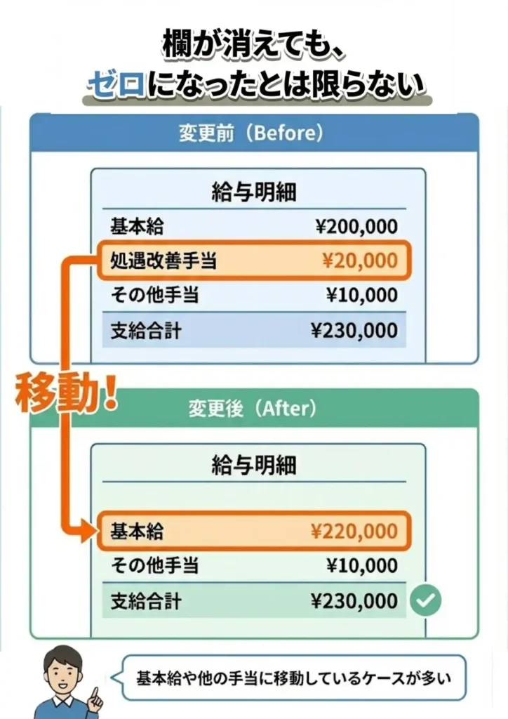 • 明細の「処遇改善手当」が減っても、基本給への振り替えで総支給が変わらないケース
