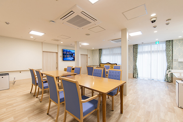 各階(ユニット)ごとに、共同の居間を設けています。 入居者様同士でおしゃべりやテレビ鑑賞、毎日のレクリエーションなど、楽しい日常をお過ごしいただくためのコミュニティ空間です。