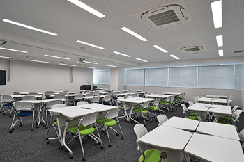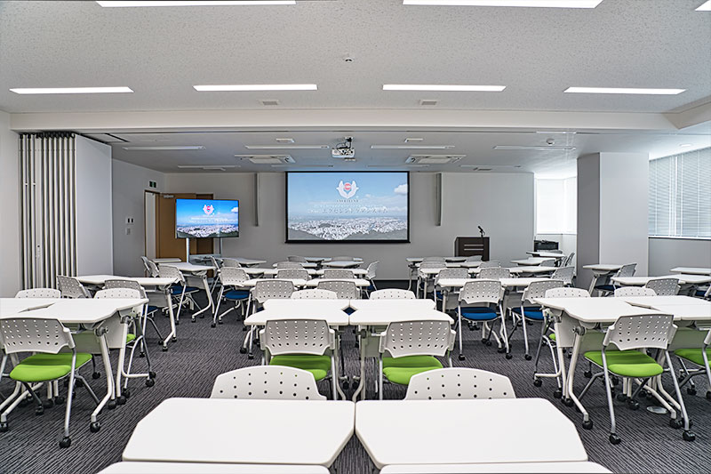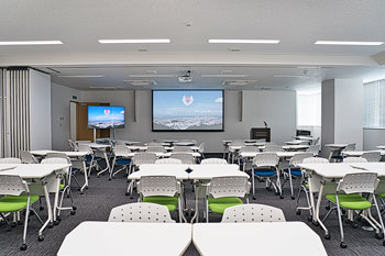 講演台・マイク(有線1本・無線2本)・BDプレーヤー・プロジェクター(天井固定/映像はBDプレイヤーまたはHDMIケーブルより入力可能)・TV(モニターとして利用)・机/椅子(65セット)・会議用長テーブル(6脚)・ホワイトボード ※机のレイアウトは自由に変更できます。 ※Bタイプ・Cタイプは利用できる設備が異なります。プロジェクターはCタイプ側のみ、BタイプはTVモニタでの対応となります。 |