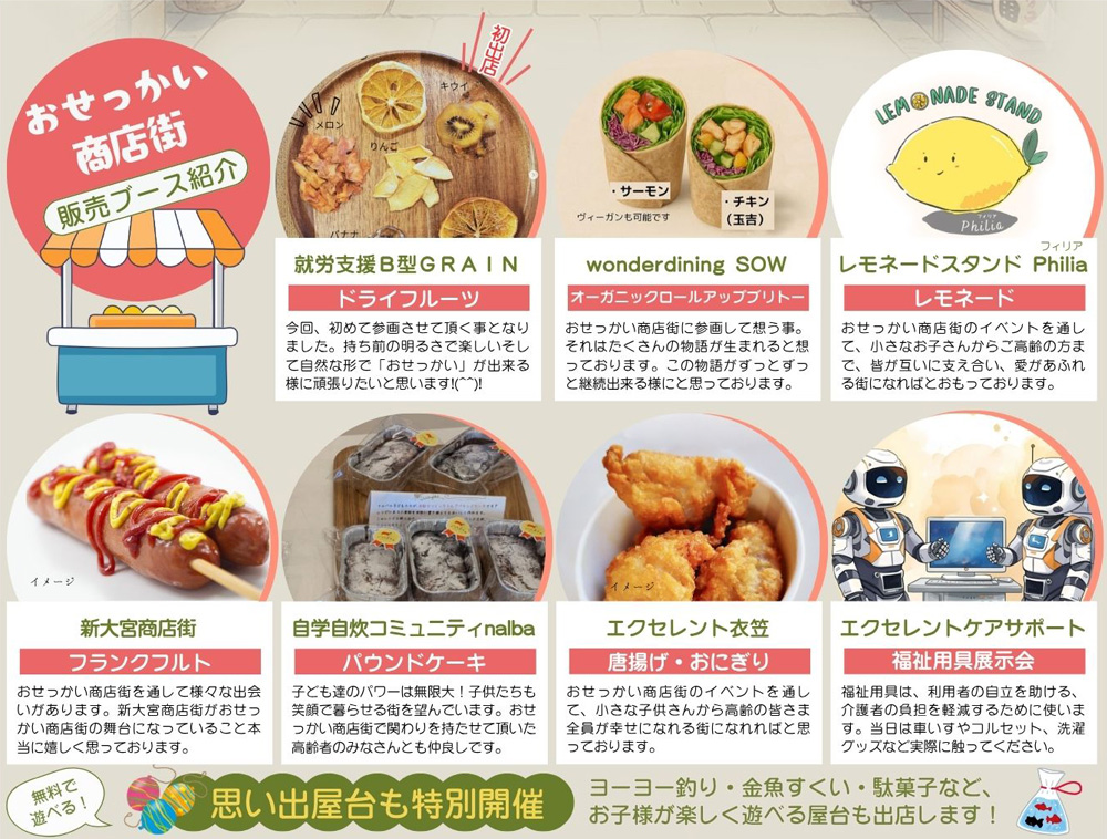 おせっかい商店街 Vol.3では、地元の様々な商店や団体による販売ブース出店のほか、ヨーヨー釣り・金魚すくい・駄菓子など、お子様が楽しく遊べる屋台も出店します!