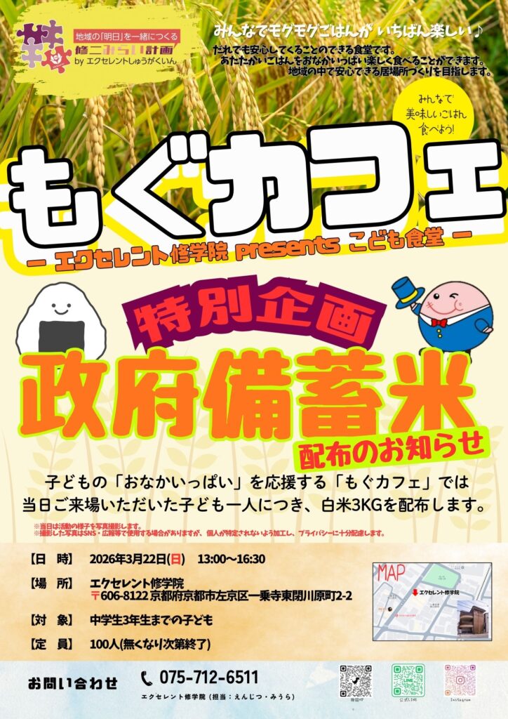 【京都市】エクセレント修学院「子ども食堂 もぐカフェ」特別企画「政府備蓄米配布」のお知らせ(2026年3月22日開催)